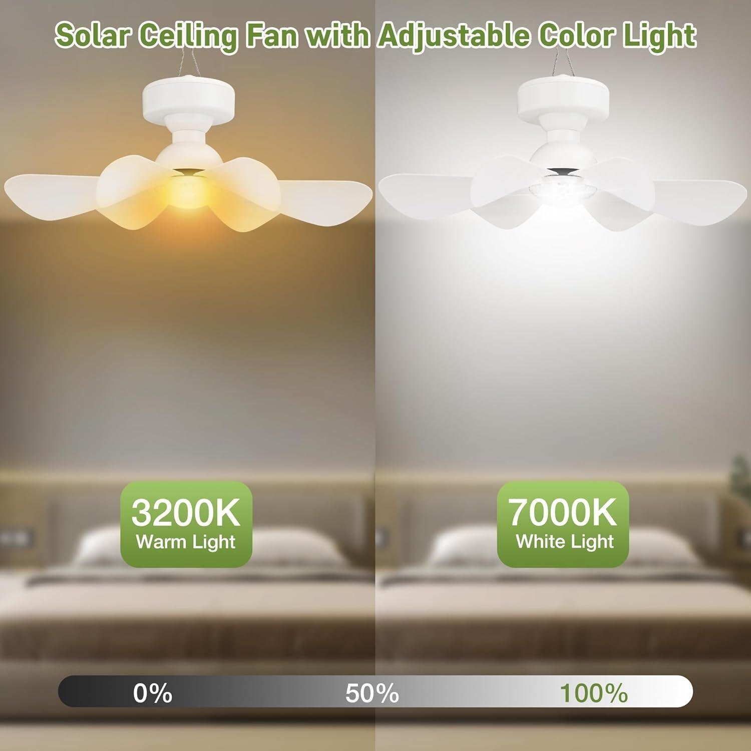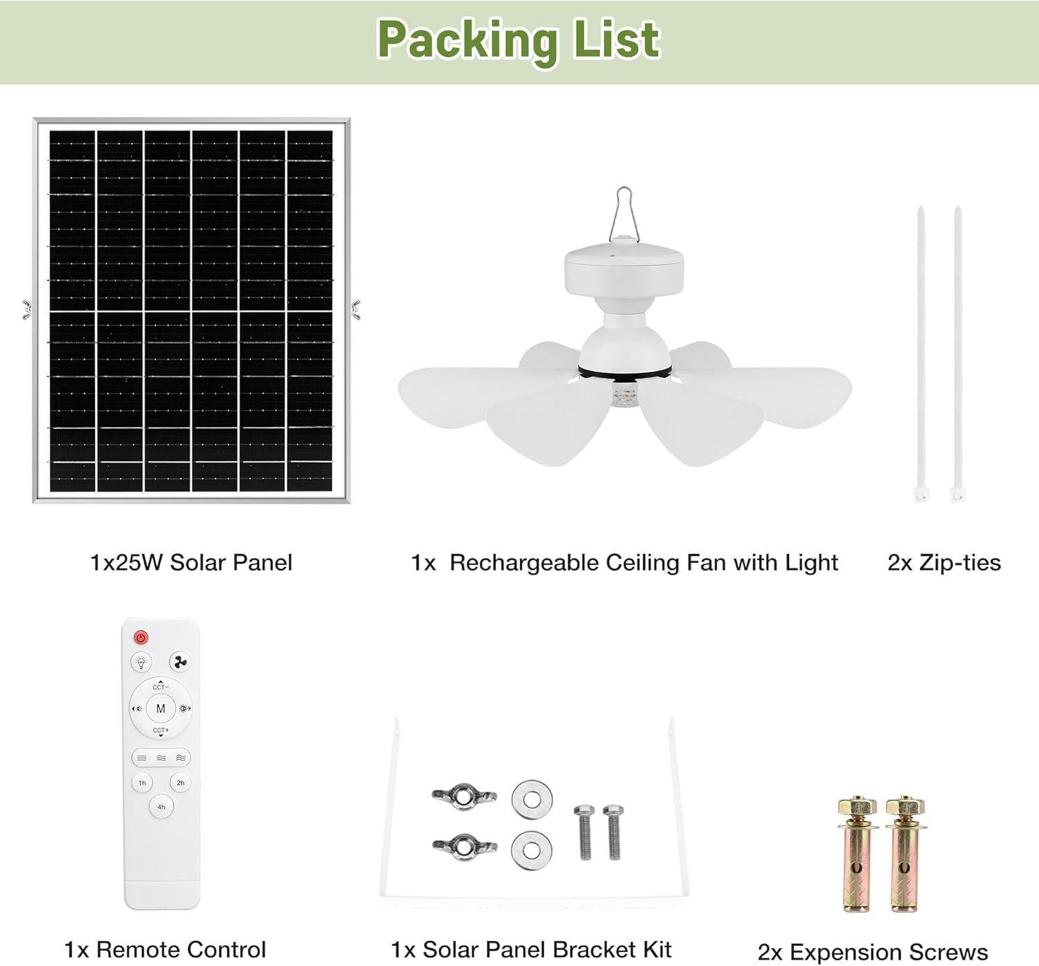 SOLAR CEILING FAN 25W SOLAR POWERED RECHARGEABLE CEILING FAN WITH LIGHT 32WH/10000MAH BATTERY BACKUP REMOTE CONTROL